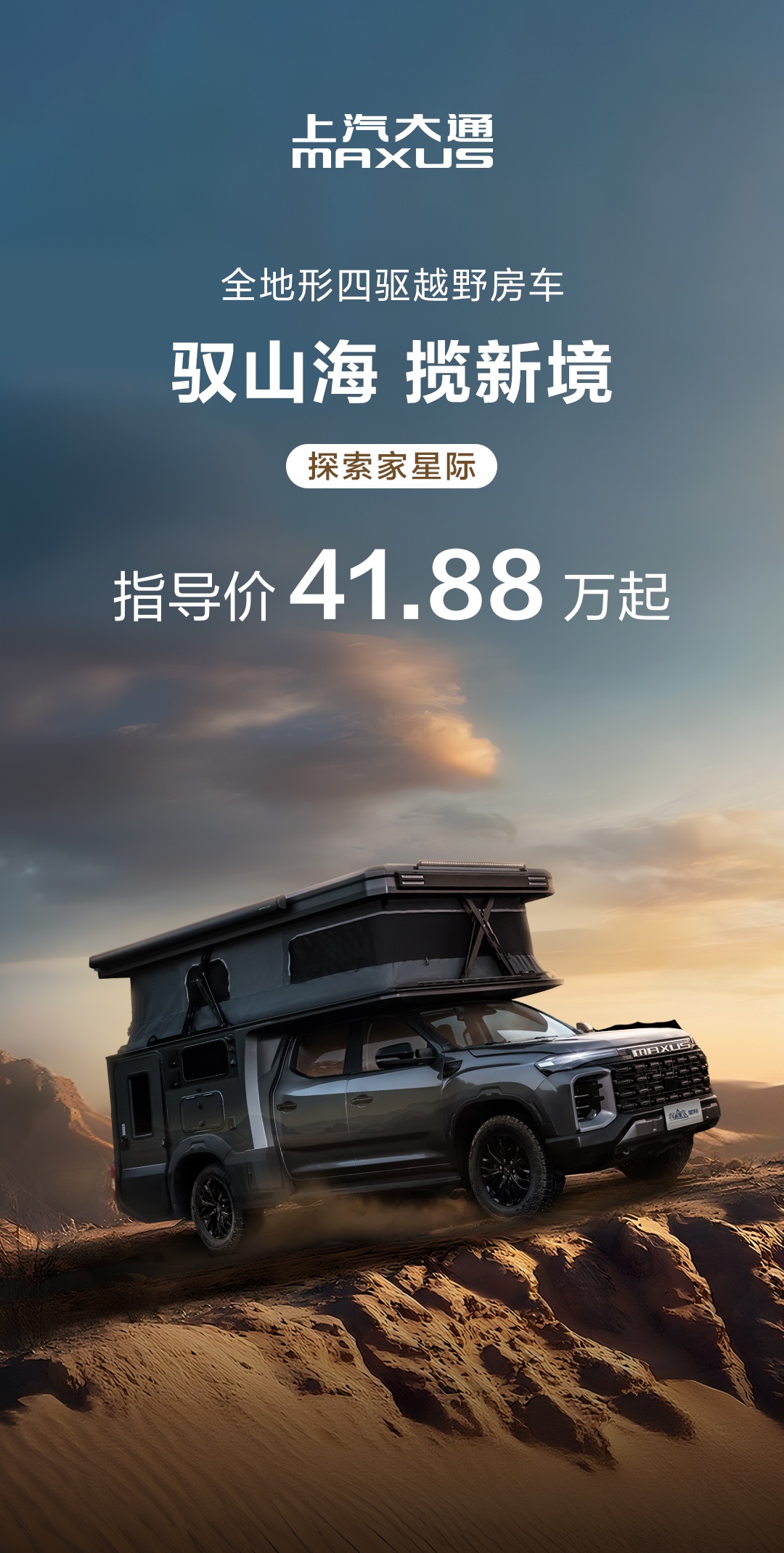新车搭载上汽 π 2.0T 柴油发动机,匹配采埃孚 8AT 变速箱,可提供 500M・m 扭矩,配备全地形智能适时四驱系统 + 2 把差速锁 + 大尺寸 AT 轮胎的组合,可轻松应对泥泞、沙地、岩石等极端路况。另外,它还采用了一套 48V 电力系统,配备 600W 太阳能板、3kW 充逆变一体机、多功能市电充电口,使得新车在行驶或停车怠速时都能快速充电。